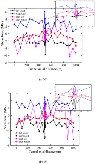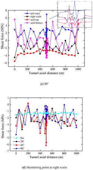Figure 11 shows the variation of the peak shear force of the lining monitoring points along the tunnel axis with different inclinations of the adverse zone. As can be seen from the figure, when the inclination angle of the adverse zone is 30°, the peak shear force and the change degree of the monitoring points along the axial top of the tunnel are smaller than that of other monitoring points. Although the difference between the peak shear force of the left and right waist monitoring points is not obvious, their change paces are completely opposite. The peak shear force of the right waist is negative, while the peak shear force of the left waist is positive. The shear force at the bottom monitoring point changes the most drastically, from the tunnel entrance to the adverse zone, the peak shear force at the bottom monitoring point is negative. Because of the adverse geological structure zone, from the adverse zone to the tunnel exit section, the peak shear force at this monitoring point becomes positive, and it becomes negative only near the exit section. In addition, the shear force at all monitoring points fluctuates strongly in the area around the adverse zone, especially at the left and right waist monitoring points, as shown in Figure 11a. When the inclination angle of the adverse zone is 45°, the change of the peak shear force is similar to that at the inclination angle of 30°. Except for the bottom monitoring point, the peak shear force along the tunnel axial variation at other monitoring points is less than that with the inclination angle being 30° in the section without the adverse geological structure zone, but greater than that at the 30° inclination angle in the section crossing through the adverse geological structure zone, as shown in Figure 11b. When the inclination angle of the adverse zone is 90°, the trend of the peak shear force variation along the tunnel axial direction at the lining monitoring points in each part of the tunnel is different from that at the inclination angle of 30°, as shown in Figure 11c. Firstly, compared with other monitoring points, although the degree of shear force variation at the top monitoring point is the smallest, the magnitude of the variation is greater. Secondly, the trend and degree of variation of the shear force with tunnel axial direction at the bottom monitoring point are completely different from other cases. Finally, the shear force at all monitoring points fluctuates more strongly around the adverse zone, and the most violent points are located in the left waist and bottom of the tunnel. Comparing the shear force peak along the tunnel axial direction at the right waist monitoring points under different inclination angles of the adverse zone, it can be found that the degree of variation of the lining shear force of the tunnel passing through the adverse geological structure zone is significantly greater than that without the adverse zone, and it presents a strong inconsistency. From the tunnel entrance to the cross section at y = 200 m, the peak shear force at the right waist monitoring point with different inclinations of the adverse zone is basically comparable, and after 200 m, the difference is increased. In the section without the adverse zone, the magnitude and the variation of the peak shear force at the right waist monitoring point for the 90° inclination are larger than other cases, while around the adverse zone, the magnitude and the variation of the peak shear force at the right waist monitoring point for the 45° inclination are the largest, as shown in Figure 11d.