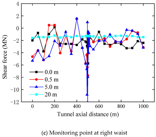 Figure 13 shows the variation of the peak shear force of the lining monitoring points along the tunnel axis with different thicknesses of the adverse zone. As can be seen from the figure, if the thickness of the adverse zone is 5 m, the trend of the peak shear force at the top monitoring point along the tunnel axial direction is symmetrical along the midpoint of the tunnel. Although the shear peaks at the left and right waist monitoring points are similar in numerical value, the pace of their changes is approximately opposite, i.e., the shear peak at the right waist being negative while that at the left waist is positive. The peak shear at the bottom monitoring point varies more strongly at the entrance and exit sections of the tunnel, while the other sections are relatively stable. Similarly, the peak shear force at all monitoring points fluctuates more strongly around the adverse zone, especially at the left and right waist monitoring points, as shown in Figure 13a. If the thickness of the adverse zone is 20 m, the trend of the peak shear force at each monitoring point is similar to that of the thickness of 5 m. However, the variation of the peak shear force at all monitoring points in the part of the tunnel crossing through the adverse zone is significantly greater than that at 5 m thickness, as shown in Figure 13b. Comparing the variation of the peak shear force along the tunnel axial direction at the right waist monitoring points with different thicknesses of the adverse zone, it can be found that the variation of the tunnel-lining shear force is significantly larger than that without the adverse zone, and it shows a strong inconsistency. The peak shear force at the right waist monitoring point from the tunnel entrance to the adverse zone is the same with the thickness of 5 m and 20 m, and both are greater than the thickness of 0.5 m. From the section around the adverse zone to the tunnel exit, the peak shear force at the right waist monitoring point with thicknesses of 5 m and 20 m is also the same, but the trend is almost opposite to that at a thickness of 0.5 m. In the section around the adverse zone, the magnitude and the variation of the peak shear force of the right waist monitoring point at the adverse zone thickness of 20 m are the largest, as shown in Figure 13c.