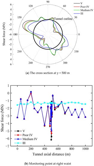The distribution of the peak shear force of the lining at the position of the y = 500 m section under the different lithologies adverse zone is shown in Figure 14a. It can be found that the distribution of the shear force with different lithologies in the adverse zone is the same in all directions of the tunnel. The lining shear force with the adverse geological structure zone is bigger than that without the adverse zone. Further, the worse the lithology of the adverse zone, the higher the lining shear force is. Comparing the variation of the peak shear force at the right waist monitoring point under different lithologies, as shown in Figure 14b, it can be found that the variation of the lining shear with the adverse geological structure zone is significantly larger than that without the adverse zone, and it presents a strong inconsistency. Except near the location of the adverse geological structure zone, the shear force along the tunnel axial direction is the same for different lithologies in adverse zones. Around the location of the adverse zone, the worse the lithology of the adverse zone, the larger the lining bending moment is.