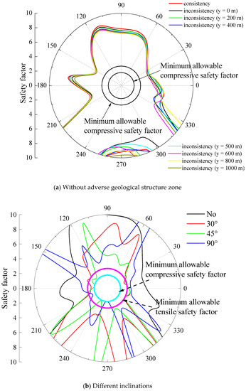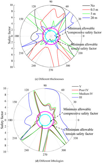 From the comparative analysis of Figure 15b, the distribution of the lining safety factor under different inclined adverse zones is also inconsistent. As a whole, the safety factor of the lining which crosses the adverse zone is lower than that without the adverse geological structure zone. In addition, when the inclination angle of the adverse zone is 45°, the safety factor of the lining is the smallest. Similarly, the distribution of the minimum safety factor of the lining under different thicknesses and lithologies is analyzed, as shown in Figure 15c,d. It can be found that the distribution of the safety factor under the adverse zone with different thicknesses is also inconsistent. However, the distribution of the safety factor under the adverse zone with different lithologies is the same. Overall, the safety factor of the lining with the adverse geological structure zone is less than that without the adverse zone, and the position of the minimum safety factor is the same. In addition, for the position where the lining may be damaged, the thicker the adverse zone, the smaller the safety factor of the lining is. Moreover, the worse the lithology of the adverse zone, the more easily the lining is damaged.
