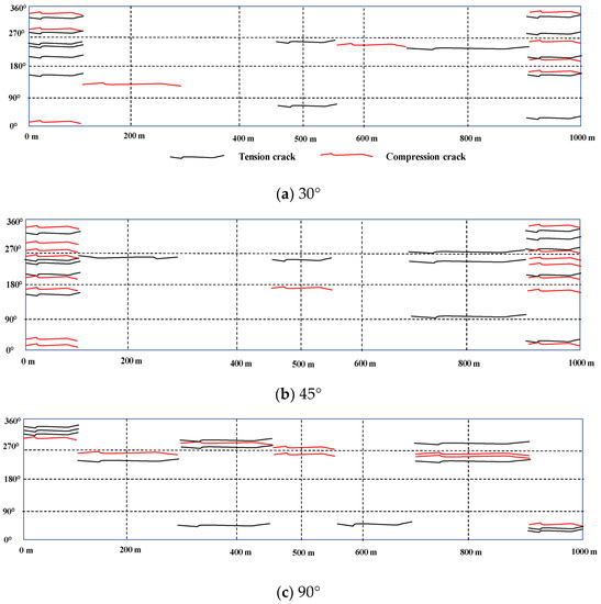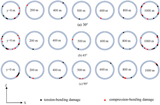 In order to judge the position of the lining with tensile failure and compression failure, taking the adverse zone with different inclinations as an example, Figure 16 is drawn to present the failure diagram of the lining with different sections along the tunnel axial direction. It can be clearly seen that the damage locations of the lining under the adverse zone with different inclinations are different. Overall, there are more potential locations for the failure of the opening and outlet lining, while relatively few other locations. If the inclination angle of the adverse zone is 30°, the positions of the tension-bending failure and compression-bending failure of the lining at the entrance and exit of the tunnel are the same, while there are more positions of tension-bending failure in the middle section. If the inclination angle of the adverse zone is 45°, the linings at the entrance and exit of the tunnel are more prone to compression-bending failure than tension-bending failure. Similarly, more tension-bending failure occurs in the middle of the tunnel. If the inclination angle of the adverse zone is 90°, although the lining at the entrance and exit has less bending failure than the other cases, more cracks appear in the middle section of the tunnel than the other cases.