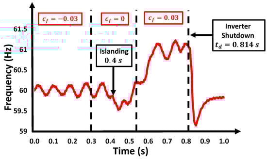 - Reis, M.V.; Barros, T.A.; Moreira, A.B.; Ruppert, E.; Villalva, M.G. Analysis of the Sandia Frequency Shift (SFS) islanding detection method with a single-phase photovoltaic distributed generation system. In Proceedings of the 2015 IEEE PES Innovative Smart Grid Technologies Latin America (ISGT LATAM), Montevideo, Uruguay, 5–7 October 2015. [Google Scholar] [CrossRef]