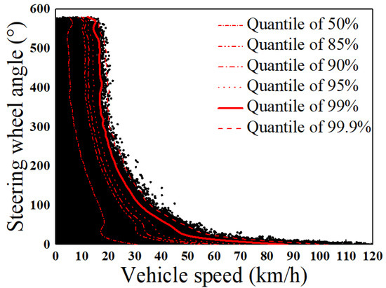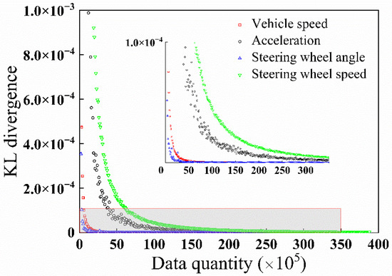 - KL divergence was applied to confirm the appropriate data quantity for the driving behaviour analysis. The result showed that the minimum data quantity for vehicle speed, acceleration, steering wheel angle and steering wheel speed were 20 × 105, 63 × 105, 10 × 105, 231 × 105, respectively, with the variation value of KL lower than 1 × 105.