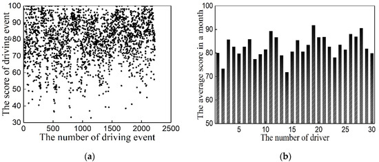 - The weights for the 11 indexes were obtained by combining the AHP and EWM methods. The scoring rules of the 11 indexes were confirmed based on the distribution of the indexes. An evaluation method of driving behaviour was proposed and verified according to the driving behaviour data of the car-hiring driver.