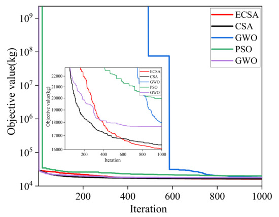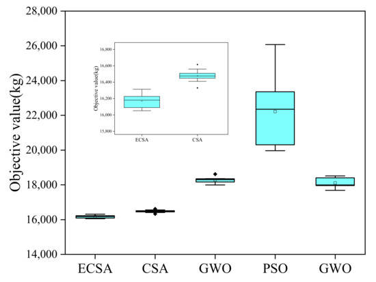 WOA: The variable A decreases linearly from 2 to 0. These methods are developed in MATLAB language and executed on a personal computer equipped with a 1.6GHz CPU and 8GB RAM, and run independently 10 times. As can be seen from Table 10, ECSA performs better when solving this model compared with the other four algorithms. In the five statistical indicators, ECSA has absolute advantages in four indicators. Only in the standard deviation, it is slightly inferior to CSA. Taking the average value as an example, compared with CSA, PSO, GWO, and WOA, the emission of polluting gases of ESCA is reduced by about 1.88%, 11.57%, 27.22%, and 10.73%, respectively.