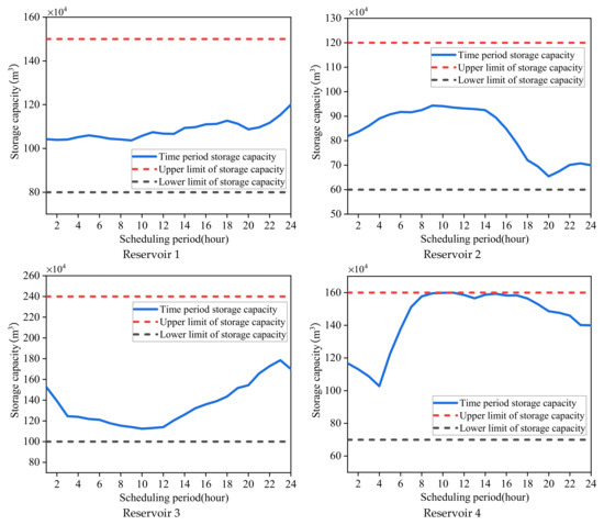 Table 13 shows the change process of the outflow and storage capacity of the hydropower station in detail. Figure 8 shows the scheduling process of storage capacity. It can be seen that the reservoir scheduling process fully meets the constraints that the system needs to meet, which proves that the constraint treatment method is feasible. In summary, ECSA and the proposed constraint treatment method can be efficiently applied to the hydrothermal joint scheduling system, which has greatly improved the solution stability and solution quality compared with other algorithms. In addition, it provides a new scientific method for solving this important hydrothermal joint scheduling model.