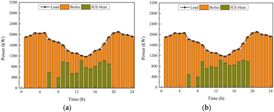 Figure 14a. As the operation power of the turbines is lower in the case considering the off-design characteristics, the operational power of ICE is higher than that of the case that does not consider the off-design characteristics.