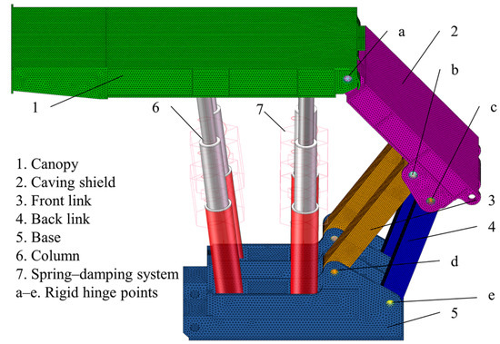The top coal caving hydraulic support is composed of the canopy, caving shield, tail beam, and base. ZF22000-29-55 top coal caving hydraulic support is selected for analysis in this paper. Its working resistance is 22,000 KN and the maximum working height is 5.5 m. The dynamic model of hydraulic support is established as shown in Figure 1. The working height of the hydraulic support is 5.5 m. Before the periodic fracture of the main roof, the hydraulic support is in a stable working state and the static load is 8000 KN. To simulate the impact load on the canopy, the point load is directly applied to the canopy, and the impact load is 1000 KN. The non-main bearing parts such as the side panel are ignored in the model. To shorten the simulation time and improve the calculation efficiency, the small structures such as round angle and chamfer are simplified and the coal caving mechanism is ignored. In pre-processing, the tetrahedron elements are used to complete the finite element mesh generation in the software of HyperMesh. The rigid node area is established at the hinged shaft hole of each component, the rotational pair connection is defined to facilitate the transfer of force, and the column is assumed as a spring damping system.