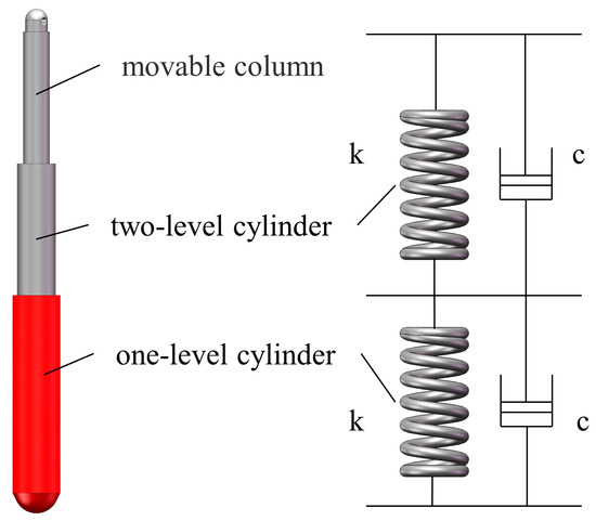 When the column extends, the cylinder is filled with high pressure emulsion. With the increase of external force, the bearing characteristics are mainly manifested in three stages. The first stage is the support setting stage. The external force on the column is less than the initial pressure in the cylinder. The one-level cylinder and the two-level cylinder are not compressed, and the equivalent stiffness of the column is infinite. The second stage is the passive support stage of the support. The external force on the column exceeds the initial pressure of the two-level cylinder. The two-level cylinder begins to be compressed and the one-level cylinder remains unchanged. At this time, the equivalent stiffness of the column is the stiffness of the two-level cylinder k2c. The third stage is the rapid pressurization stage of the bracket. The external force of the column exceeds the initial pressure of the one-level cylinder, and the one-level cylinder and the two-level cylinder are compressed. At this time, the equivalent stiffness kc of the column is the series connection of the one-level cylinder stiffness k1c and the two-level cylinder stiffness k2c. Under the action of external force, the cylinders at all levels and emulsions are in the state of solid–liquid coupling [26,27]. The stiffness k1c of the one-level cylinder and the stiffness k2c of the two-level cylinder can be defined as Equation (1):