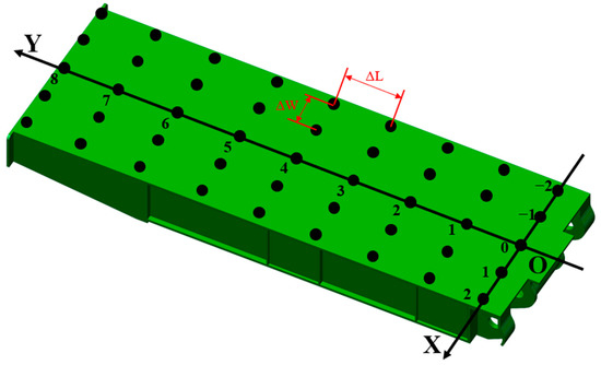 In practice, the contact between canopy and roof is usually random and irregular. When the main roof has periodic fractures, the canopy will also be subjected to impact load based on the original load, which is easy to cause the wear of the hinge hole and even the fracture of the pin shaft. To analyze the impact response of the canopy load impact position to the hinge point, a total of 45 impact load points are selected. As shown in Figure 4, the X-axis direction represents the width direction of the canopy, and the interval ΔW = 420 mm from (−2, Y) to (2, Y). The Y-axis direction represents the length direction of the canopy, and the interval ΔL = 420 mm from (X, 0) to (X, 8). The origin O is on the central surface of the canopy.