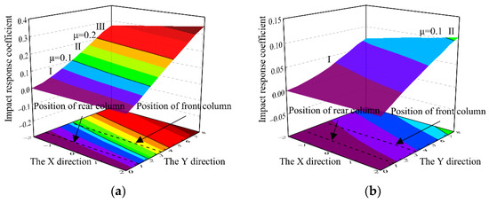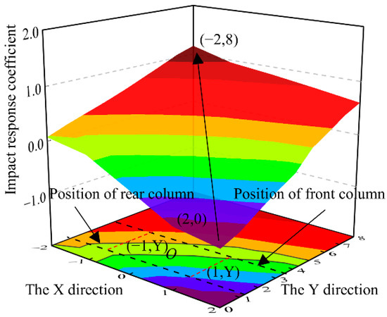 It can be seen from Figure 5a that when the impact load moves along the positive direction of the X-axis, the impact response coefficient of the hinge point of the front column shows an increasing trend, and the column will have obvious the eccentric load effect. The analysis of reference [8] also supports this result. The closer to the origin direction, the smaller the eccentric load effect of the column is. This is because there are two front columns in the X direction, and the different positions of the impact load will cause different impact responses to the front columns on each side, resulting in the eccentric load effect of the column. At the same time, the impact amplitude of the column on the opposite side of the impact load will decrease due to the influence of the bending moment. Therefore, the closer the impact load is to one side of the front column, the compression of the front column will increase. When the impact load moves along the positive direction of the Y-axis, the impact response coefficient of the hinge point of the front column shows an increasing trend, and the change of the impact response coefficient covers three sections. In (−2, Y), the front column action line divides section I and section II, and in (2, 8), the impact response coefficient of the front column hinge point reaches the maximum. This is because the canopy is divided into three regions by the column hinge point. When the impact load acts on the back end of the canopy, the bending moment effect of the impact load on the front column hinge point will be weakened due to the support effect of the rear column. However, as the impact load crosses the action line of the front column, the stress state of the canopy is similar to that of the cantilever beam. The longer the force arm is, the greater the bending moment generated at the hinge point of the front column is, increasing in the impact response of the hinge point of the front column. Therefore, when the impact load is close to the front end of the canopy, the impact adaptability of the front column is continuously reduced, and the load condition is more serious.