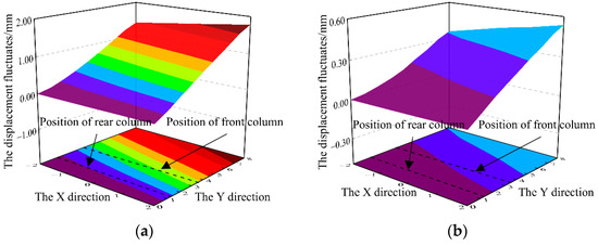 It can be seen from Figure 6 that the displacement fluctuation trend of the column hinge points is similar to that of their impact response coefficient. When the impact load moves along the positive direction of the X-axis or the Y-axis, the displacement fluctuation amplitude of the column hinge points increases gradually. The displacement fluctuation amplitude of the front column hinge point is larger, and the displacement fluctuation trend of the rear column hinge point is gentle. This is because the impact responses of the front and rear column hinge points are different, and the impact response of the front column hinge point is more intense. Therefore, under the impact load, the canopy will show a low-head attitude, and as the impact load moves to the front of the canopy, the phenomenon of the canopy’s being low-head is increasing.