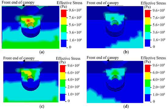 (a) Stress distribution of the hinged hole of the front column under impact load. (b) Stress distribution of the hinged hole of the rear column under impact load. (c) Stress distribution of the hinged hole of the front column under normal load. (d) Stress distribution of the hinged hole of the rear column under normal load.