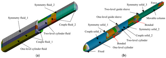 In Figure 10a, since the pressure and volume changes of the liquid cannot be ignored, the fluid domain is defined as compressible fluid. The coupling surface between the fluid domain and the solid domain should satisfy one-to-one correspondence. In the dynamic mesh setting, using the method of Remeshing and Smoothing mesh updating, the dynamic mesh area is selected as the fluid-solid coupling surface and defined as system coupling. In Figure 10b, the one-level guide sleeve and the two-level guide sleeve are connected with the corresponding cylinder body by a thread in the actual situation, but the thread is not created in the column modeling. Therefore, the contact type between the guide sleeve and the cylinder body is defined as binding contact, and the other positions are positioned as friction contact. The column hinge force is applied at the hinge hole of the movable column, and the full constraint is defined at the bottom of the one-level cylinder. The data connection between the fluid domain and the solid domain is established in the System Coupling module, and the convergence of the two is judged by the trend of the residual curve. After the fluid–structure interaction simulation is completed, the Result module is used to analyze the dynamic characteristics of the column under impact load.