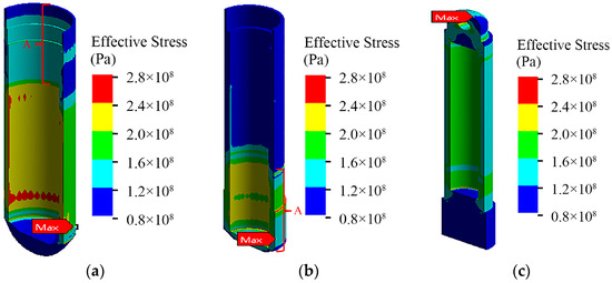 It can be seen from Figure 12 that in condition (b), the analysis of reference [30,31] also supports this result, the stress values of the movable column and the two-level guide sleeve are significantly increased, and the maximum stress point of the two-level cylinder is transferred to the bottom of the cylinder, and the stress value of area A in the two-level cylinder is significantly increased. However, the one-level cylinder and its guide sleeve stress change little. This is because the amplitude of the impact load on the canopy is small, the external force on the column has not yet reached the initial pressure of the one-level cylinder, and the column is in the passive support stage, resulting in only the two-level cylinder being greatly affected by the impact load. Combined with the analysis of the guide sleeve stress and reference [32], due to the impact load, the pressure of the guide sleeve increases, especially the stress of the two-level guide sleeve increases obviously. Therefore, when the canopy is subjected to the impact load, the two-level cylinder will first appear in impact response. To ensure the supporting capacity of the column, the compressive and wear resistance of the inner surface of the two-level guide sleeve should be strengthened, and the bottom and wall of the two-level cylinder should be thickened to prevent cylinder expansion.