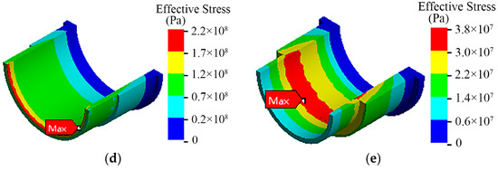 (a) Stress distribution of the one-level cylinder under condition (b). (b) Stress distribution of the two-level cylinder under condition (b). (c) Stress distribution of the movable column under condition (b). (d) Stress distribution of the hinged hole of the one-level guide sleeve under condition (b). (e) Stress distribution of the two-level guide sleeve under condition (b).