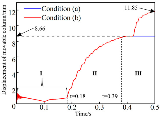 It can be seen from Figure 11 and Figure 12 that in conditions (a) and (b), the column is in the passive support stage, the two-level cylinder is compressed, and the one-level cylinder remains unchanged. To analyze the amount of liquid compression in the cylinder, the displacement of the movable column under two conditions is used to react. The displacement curve of the movable column is shown in Figure 13.