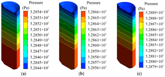 It can be seen from Figure 13 that due to the effect of the impact load, the movable column will appear an obvious shrinkage phenomenon, so that the liquid in the cylinder is continuously compressed, resulting in a continuous increase of the liquid pressure. To intuitively see the impact load on the column fluid domain pressure, the column fluid domain pressure changes in condition (a) and condition (b) are compared. The pressure distribution of the one-level cylinder fluid domain is shown in Figure 14, and the pressure distribution of the two-level cylinder fluid domain is shown in Figure 15.