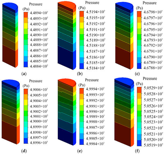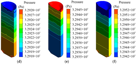 (a) Pressure distribution in the fluid domain of the one-level cylinder under condition (a). (b) Pressure distribution in the fluid domain of the one-level cylinder under impact 0.01 s. (c) Pressure distribution in the fluid domain of the one-level cylinder under impact 0.02 s. (d) Pressure distribution in the fluid domain of the one-level cylinder under impact 0.03 s. (e) Pressure distribution in the fluid domain of the one-level cylinder under impact 0.04 s. (f) Pressure distribution in the fluid domain of the one-level cylinder under impact 0.05 s.