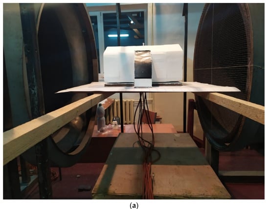 Figure 1, (a) shows a photo of the model of the house in the working part of the wind tunnel and the scheme of the experimental installation. (b) shows that the basis of the model simulated a smooth surface of the earth without plantings and with low roughness. The flow regime was turbulent.