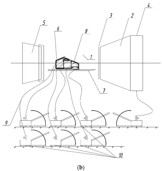 Photo of a model of a modular house in the working part wind tunnel: (a) scheme of experimental setup; (b) 1—working part of the wind tunnel; 2—nozzle; 3—leveling grid; 4—prechamber; 5—diffuser; 6—model of the house; 7—underlying surface of the model; 8—drainage points (static pressure selection); 9—flexible tubes; 10—micromanometers MMN.