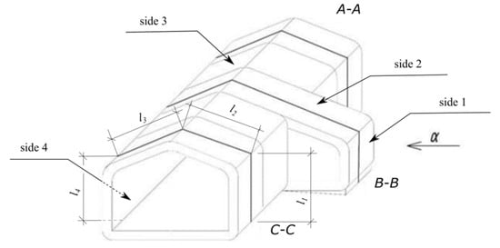 The research was carried out in the direction of the oncoming air flow along the running linear coordinate l in three characteristic sections A-A, B-B and C-C, which are located on flat surfaces side 1, side 2, side 3 and side 4.