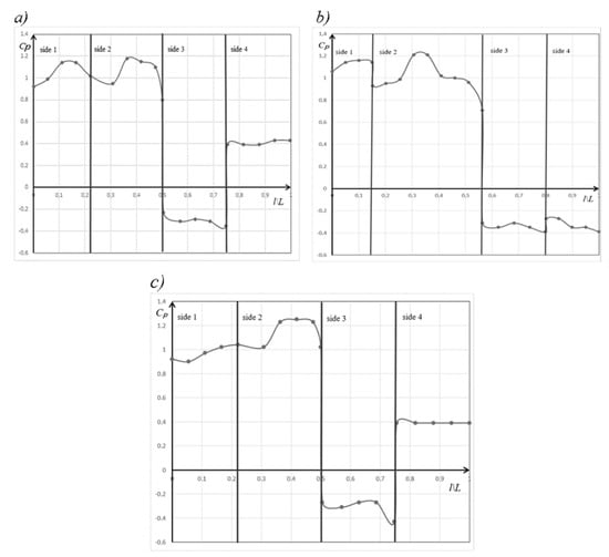 As a result of experimental studies, it was found that on the rear facade of the model (side 4), from the side of the oncoming air flow, there is a vacuum. The minimum value of the pressure coefficient reaches Cp = −0.4 in contrast to the other two sections A-A and C-C, for which these values on the same facade are positive. This can be explained by the originality of the shape of the model block, in particular its convexity in the section B-B. The possibility of installing a thermosyphon solar collector in this section was evaluated and the results of research confirmed this possibility, as evidenced by the fact that the front facade on the side of the oncoming air flow (side 1 and side 2) is supported. In addition, from the graphical dependencies (Figure 3b), you can see that Cpl\L = 0.05 > Cpl\L = 0.56; this will further create the energy potential for air movement in the thermosyphon solar collector, which will be the next stage of research.