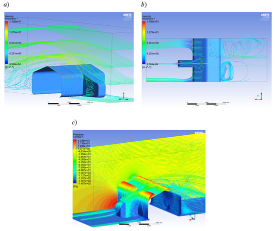 To assess the adequacy of the experimental studies, a comparison was made between the obtained data and the results of computer simulations, which were conducted on the ANSYS platform. The information here has been used to validate the velocity and turbulence intensity profile. The model’s dimensions were kept the same to enable comparisons of the different parameters [,]. A similar shape of a modular building, which was studied in a wind tunnel, was adopted for modeling. Figure 4 presents diagrams of the distribution of the speed of the oncoming air flow at α = 0° and pressure distribution on the surface of the model.