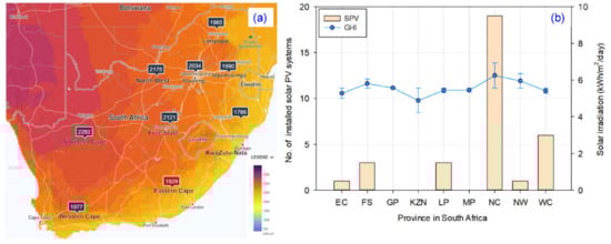 Despite the abundant year-round solar energy resources in South Africa, very few utility-scale solar PV plants are operational in the country, and those that are present are limited to certain regions. A GSA map of South Africa showing the total annual GHI and installed solar PV (SPV) per province is presented in Figure 1a,b, respectively [10].