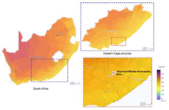 In terms of weather conditions, the town falls under zone 2 in South Africa, i.e., with temperate interior climate [28]. The total annual global horizontal irradiation in Alice is illustrated in Figure 2 [10].