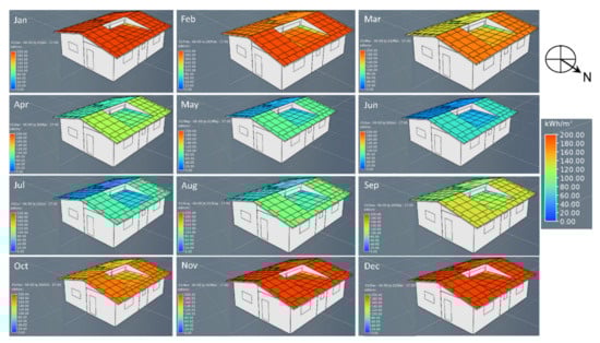 The solar exposure in Alice for a typical rooftop solar PV system was simulated and expressed in monthly solar irradiation in an imaginary grid of 1 m2, as presented in Figure 4. In other words, Figure 4 visualises the solar irradiation on the roof of a house in a 1 m2 grid. It indicates the area of the roof with optimal monthly solar radiation. For example, the south-facing side of the roof has a low solar exposure throughout the year and, thus, a relatively low solar irradiation and potential for solar PV power generation. However, the roof’s north-facing side experienced a higher solar exposure and resultant solar irradiation all year round. On the north-facing side, between November and February, which represents the peak summer season, the average solar irradiation was approximately 180.00 kWh/m2, equivalent to 6 kWh/m2/day. The peak winter season average solar irradiation from June to August was approximately 15.00 kWh/m2, i.e., equivalent to 4 kWh/m2/day. As such, north-facing solar PV systems will have an optimum yield in Alice.