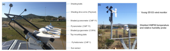 The shaded pyranometer located at the extreme right of the top mounting plate was used to measure diffuse solar radiation. Thus, the shading balls attached to the payload were designed to cast shadows on the shaded pyrgeometer and pyranometer. Therefore, the radiometers were constantly shielded from direct solar radiation as the shading balls moved with the payload. The unshaded pyranometer in the middle of the top mounting plate measured the GHI. The radiometers (CHP1 and CMP 11) in Figure 5 used a sensing element called a thermopile. The optical and electrical specifications of the radiometers considered in this study are summarised in Table 4 [40,41].