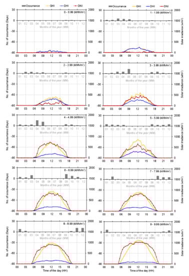 In Figure 10, the bars represent the number of days on which a particular class occurred in the year. For example, the total daily GHI class of 0–0.99 kWh/m2 occurred twice, in September and October. This represents only 0.7% of the entire days of the summer season. The average GHI, DNI, DHI distribution on both days constitute the respective solar irradiance profiles given in the class. Similarly, the class with the highest total daily GHI of 9–9.99 kWh/m2 occurred 14 days in the season, with 50% of the days occurring in January. Classes 4–4.99 and 6–6.99 kWh/m2 were the most dominant, with each class representing 15% of the total summer days. Moreover, class 4–4.99 kWh/m2 was mostly observed in April, making up half of the days in the month, while 6–6.99 kWh/m2 was experienced on 12 days in September.