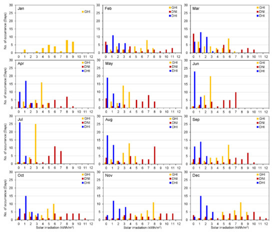 Comparing Table 6 and Table 7 as well as Figure 10 and Figure 11, DNI was higher than GHI, specifically, on clear sky days. This can be attributed to the pyranometer orientation and pyrheliometer operation (see Section 4.2) concerning the daily seasonal movement of the sun in the sky. At midday in the southern hemisphere, the sun is low on the horizon in the winter season and high in the sky during summer. Since the pyrheliometer is constantly pointed towards the sun disc, the seasonal daily transverse of the sun in the sky has a minimum impact on the observed DNI. This was not the case for the GHI, which was monitored by a horizontally stationed pyranometer on a plane. The pyranometer receives less irradiance in the winter due to increased air mass (AM) as the sun angle reduces [47]. Additionally, the mean DNI in the winter season was found to be higher than that of summer. According to Ziuku et al. [48], similar findings indicated that the seasonal DNI difference could be attributed to the cold, dry winter clear sky conditions and the cloudy, rainy summer season, which are typically experienced in Southern Africa. Figure 10 and Figure 11, as well as Table 6 and Table 7, do not provide details of the frequencies of occurrence for DNI and DHI. Thus, Figure 12 presents monthly bar charts of the daily total GHI, DNI, and DHI regarding their frequency of occurrence.