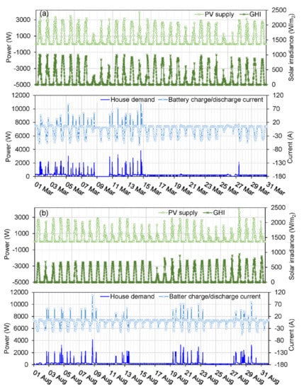 Two months of data, including a typical summer (March) and winter months (August), were considered in analysing the solar PV system performance. The on-site measured global horizontal irradiance (GHI), solar PV power generation, and the house load demand in the two months covered, are presented in Figure 13.