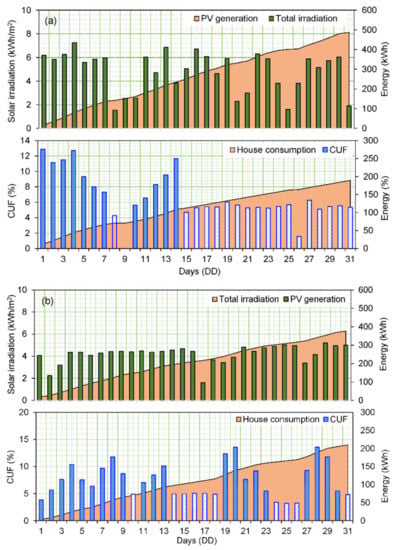 A 7% average CUF was also obtained in the winter months. In the same period, 14% CUF on the 20th of August was the highest value obtained; this day was categorised as HDP, while for LDP, 25th of August had the lowest CUP, i.e., 3%. The total global horizontal irradiation in the winter months was 130.93 kWh/m2, equivalent to a daily average of 4.22 kWh/m2. The resultant generated solar PV energy was 246.29 kWh, equivalent to 13.9 kWh/day. However, only 159.80 kWh energy was consumed during HDP and 50% less during LDP in the winter month. Equations (1) to (6) were employed to further evaluate the performance of the solar PV system, and the findings are presented in Figure 15 and Figure 16.