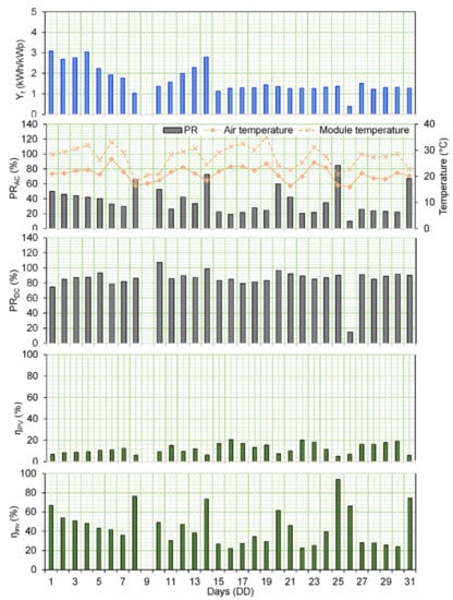 where PRAC is performance ratio based on AC energy, in this case, the inverter energy output. Although PRAC is dimensionless mathematically, it is often expressed in percentage (%) among researchers [24]. According to Marion et al. [18], PRAC is usually determined over a month or year period; weekly or daily PRAC values are useful for diagnosing component failures in PV systems. PRDC, which is based on the generated DC energy before the inverter, can be computed by substituting with in Equation (4). Furthermore, the PV module () and inverter () efficiencies which were both considered as the PV system efficiency in this study, can be respectively determined by [25]