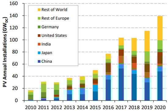 Solar PV power accounts for 3.1% of all electricity worldwide. Even the COVID-19 pandemic did not significantly impact solar deployment in 2020, given that installed renewable power capacity increased by more than 256 gigawatts (GW) during the pandemic, the highest increase ever [90]. Global PV capacity increased from 17 GWDC to 139 GWDC between 2010 and 2020 (see Figure 1). European markets led at the start of the decade, but PV growth shifted to Asia. By 2020, 57% of cumulative PV installations were in Asia, 22% in Europe, and 15% in the USA. At the end of the last decade, Germany, China, Japan, the USA, and India led the dominant markets in terms of cumulative PV installations. In 2020, China’s yearly PV installations increased by 60%, accounting for more than one-third of global deployment. In terms of both cumulative and annual installations, the USA was the second-largest PV market. PV installations climbed dramatically in many important markets, including the USA, within the first nine months of 2021. India installed 177% more solar panels than it did in the same period in 2020 during the same period in 2021. In total, 171 GW of PV was added worldwide by the end of 2021. As predicted by analysts, annual global PV installations will continue to rise, with an average projection of 209 GWDC and 231 GWDC in 2022 and 2023, respectively [1,91].