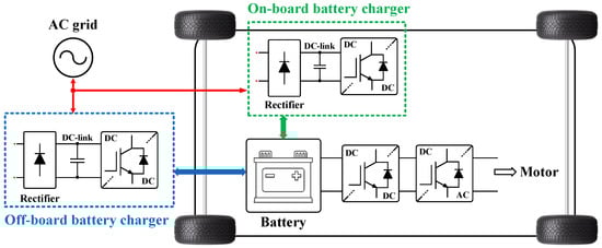 Nowadays, most EVs have off-board DC fast chargers in addition to an on-board charger (OBC) embedded in the EV, which is used for slow charging overnight. The primary issue related to an OBC is the voltage range (up to 120 Vac), and hence charging power limitations caused by space and weight issues, in addition to cost constraints. Nevertheless, as EV battery capacity grows, the power in OBCs drastically increases. Early EVs using OBCs could only charge at 3.3 kW, but almost all EVs can now charge at 6.6 kW, 7.4 kW, 11 kW, and more (up to 20 kW) [92,93]. Despite the higher cost of off-board DC charging stations, they offer some attractive features, such as lightening the EV’s weight and charging at much higher power levels (quicker charging) compared to their on-board counterparts.