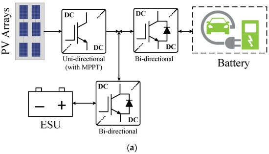 The main disadvantage of non-integrated architectures for EV charging is the requirement to control at least three converters, namely, the PV-interfaced DC–DC converter for the MPPT algorithm, the single/three-phase grid-connected converter, and the EV-interfaced DC–DC converter for the battery’s charging. Therefore, non-integrated architectures suffer from increased complexity and high power losses. Alternately, multi-port integrated topologies for EV charging can integrate EV (or ESU), PV, and the grid using one single-stage power conversion system alone, resulting in higher power density, smaller-scale communication infrastructure requirements, lower cost, and higher efficiency as a result of a reduced number of power stages [18,86,87,88,89].