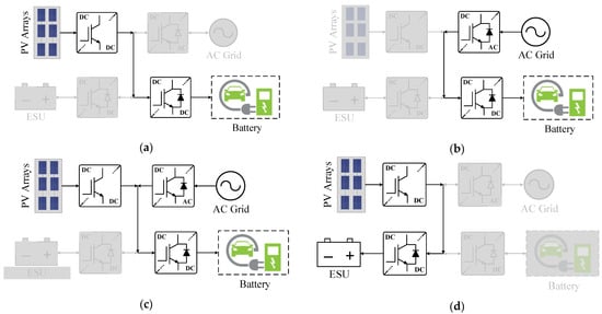 Mode 4 (PV-to-ESU (PV2ESU)): When there is no EV to be charged, then all the available PV power is directed to the ESU using the PV- and ESU-interfaced DC–DC converters (Figure 4d). This mode aids the charging system in reducing grid reliance by storing energy in the ESU for later use, particularly during rush hours.