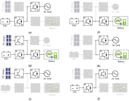 Operating modes of PV-grid charging system: (a) Mode 1: PV-to-EV, (b) Mode 2: Grid-to-EV, (c) Mode 3: PV and grid-to-EV, (d) Mode 4: PV-to-ESU, (e) Mode 5: Grid-to-ESU, (f) Mode 6: ESU-to-EV, (g) Mode 7: PV and ESU-to-EV, (h) Mode 8: EV-to-grid (V2G), (i) Mode 9: PV-to-grid, and (j) Mode 10: ESU-to-grid.