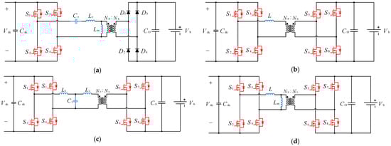 Isolated DC–DC converters as the EV-interfaced converter: (a) Full-bridge 3-level LLC resonant converter, (b) dual-active bridge (DAB) converter, (c) dual-active bridge (DAB) LCL resonant converter, and (d) phase-shifted full-bridge (PSFB) converter.