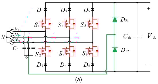 The grid-interfaced converter controls power transfer from the utility grid to the EV battery charger. Depending on the current flow direction, this converter can operate either in the rectification (AC–DC) or inversion (DC–AC) mode, delivering power from the grid to the EV or feeding it back into the grid (under V2G mode), respectively [9]. Further, during the daytime and when there is no EV to be charged, this converter can be used to transfer the available PV power into the grid. Bi-directionality, high-power density, low total harmonic distortion (THD), galvanic isolation, and high efficiency are the primary converter requirements [26]. The bidirectional voltage source inverter (VSI) shown in Figure 10 has been the most commonly used converter in the literature as the grid-interfaced converter [19]. Depending on the output voltage, this converter can operate as a step-down (buck) [28,29,30,31,32,33,34,35,36,37,38,56,57,58] or (boost) [43,44,45] converter. However, the conventional VSI suffers from low efficiency. Other potential topologies with higher efficiencies include SWISS [27,39,41] and VIENNA converters [40,42,54] (See Figure 11). Moreover, the SOC of the EV batteries with a capacity of 20 kWh-40 kWh must reach 80% within 30 min. The output power of the converters can be stacked to satisfy the requirements of EV chargers using a modular approach [130,131]. Therefore, in EV fast and ultra-fast charging applications, multilevel converters (MLCs), including Cascaded H-Bridge (CHB) [46,47], Flying Capacitor (FC) [48,49], and Neutral Point Clamped (NPC) [50,51,52,53] converters have been preferable in some publications (see Figure 12). Their outstanding advantages include low THD, smaller dv/dt, minimized magnetic components, less voltage stress across the semiconductor devices in high-voltage applications (e.g., 100 V rated switches within the 400 V voltage battery range), low electromagnetic interference (EMI), and a low rated switch, in addition to reduced voltage transition between levels [132,133,134,135,136,137,138,139,140,141,142,143]. However, reliability, voltage balancing, high cost, and complex structure and control are some concerns related to MLCs. A technical comparison among examples of grid-interfaced converters is presented in Table 4. Grid-connected converters inject harmonics into the grid, degrading power quality. In order to ensure that input sinusoidal currents are in phase with grid voltages, power factor correction (PFC) solutions have been developed in the literature [2].