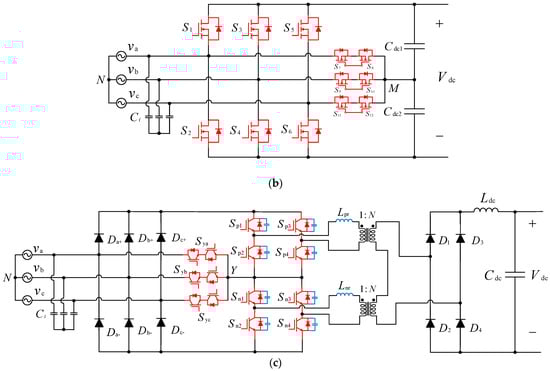 Grid-interfaced topologies: (a) Three-phase modified Buck type converter, (c) VIENNA converter, and (c) SWISS converter.