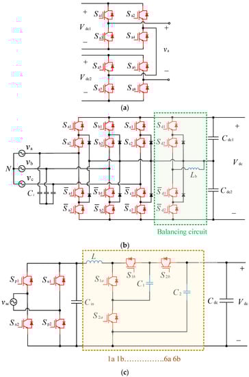 Multilevel converters (MLCs) used as grid-interfaced converter: (a) Cascaded H-Bridge (CHB), (b) Neutral Point Clamped (NPC), and (c) Flying Capacitor (FC).