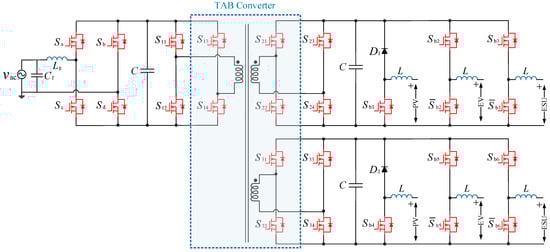 An isolated four-port topology integrating PV, a grid, energy storage, and EV is presented in [88]. As shown in Figure 14, the sub-converters include a triple active bridge (TAB) converter, a bidirectional DC–DC converter interfacing with the EV battery to provide bidirectional power flow capability, a DC–DC unidirectional boost converter for the PV port, and a bidirectional converter to interface with the utility grid. The proposed topology offers electrical isolation and modularity. It could be more advantageous by supporting a wide range of DC sources utilising a multi-winding transformer. However, although soft-switching is guaranteed for the TAB converter, the three sub-converters suffer from hard switching, particularly in high-power applications.