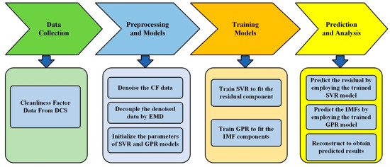 - Apply the well-trained SVR model to forecast the future residual value, and use the well-trained GPR models to predict the values of each IMF. Combine these results to obtain the predicted cleanliness factor value.
