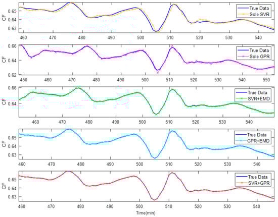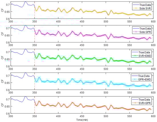 To emphasize the effectiveness of our proposed SVR + GPR model, the sole SVR model, the sole GPR model, the sole SVR + EMD model, and the sole GPR + EMD model are compared. In the first two models, the denoised cleanliness factor data is handled by using the sole SVR model and the sole GPR model, respectively. In the last two models, the SVRs and GPRs are utilized to deal with all signals acquired after EMD dissolution, separately.