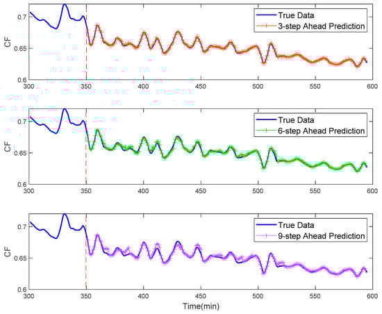 Figure 10 and Figure 11 shows the k-step-ahead predicted values of cleanliness factor for the economizer and the reheater using the proposed model. It is evident that there are a few short-period mismatches in the multistep predictions, which is largely because of the shortage of a priori information. Nevertheless, the prediction results gradually rematch the actual data again as a result of the valid decoupling and the powerful long-time capture capacity of the hybrid SVR + GPR model. As the number of predicted steps increases, there will be more mismatches, which is because the long-step forecast involves more indetermination. From Table 3 and Table 4, the RMSE, MAPE and MAE for the economizer and the reheater become larger with the increase in the number of prediction steps. However, all these evaluation criteria are less than 0.003, which means that the forecast performance is satisfactory for the multistep cases. Hence, our proposed SVR + GPR model also has good quality of extrapolation for cleanliness factor multistep-ahead prediction.